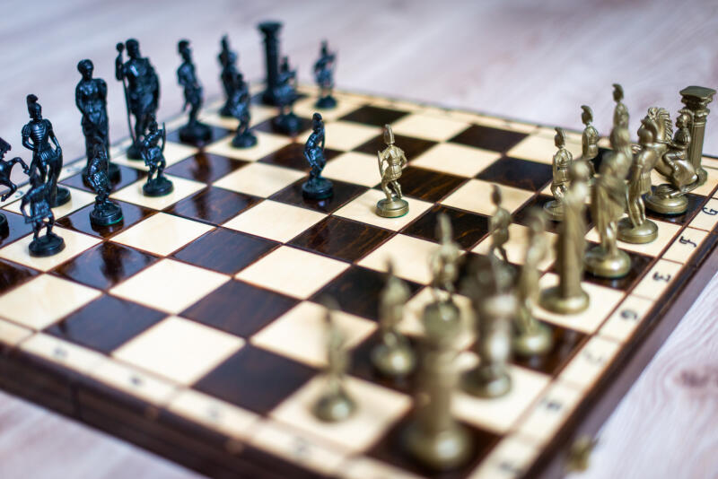 Arany-fekete sakkfigurák spártai harcosokként egy gyönyörű sakktáblán.