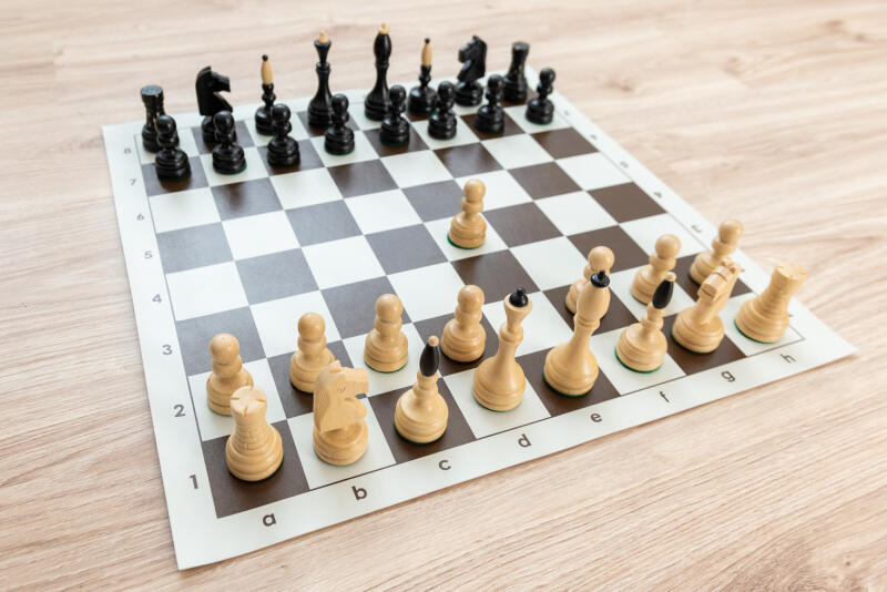 Feltekerhető barna sakktábla, táblaméret 50x50 cm,  mezőméret 5,5x5,5 cm.