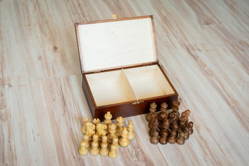 A csomag MAXI fa dobozt és klasszikus akác sakkfigurákat tartalmaz.