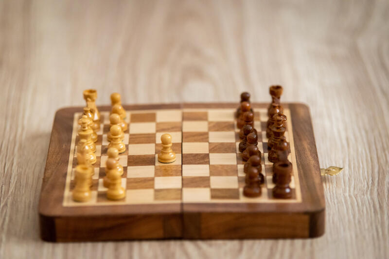Otthoni játékra, valamint utazásra alkalmas mágneses fa sakk-készlet.