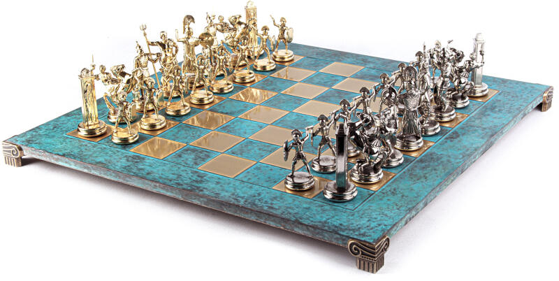 Sakkfigurák A készlet minden egyes darabja egy-egy remekmű, amely a görög szobrászat hagyományait idézi, és az isteni konfliktusokat jeleníti meg. A király a híres „Meloszi Poszeidón szobor (Kr. e. 2. század) másolata. A