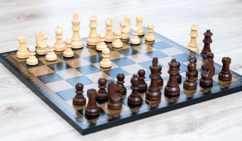 Hagyományos sakktábla kézzel készült fából, műbőrrel borítva, aranyszínű díszítéssel a szélein.